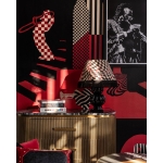 A sophisticated, fashion-forward print, SOLITUDE exudes drama with monochromatic stripes and checkerboard patterns contrasting its black and red backdrop. Depicting musicians performing within a decorative interior, stairs and doorways add depth and perspective inviting viewers to wonder what lies deeper within this glamourous jazz club setting. Inject opulence and atmosphere into the home, especially when displayed at scale.