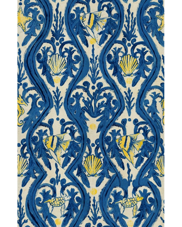 Experience the Zakynthos wallpaper featuring traditional deep-sea blue and fresh lemon yellow shades. This beautiful design showcases rich marine symbols, with elegant details of sea tangle and delicate fish, embodying authentic Greek vibes.