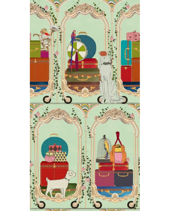 Περίτεχνα καροτσάκια αποσκευών περιμένουν να φορτωθούν στο τρένο, ενώ τα κατοικίδια ζώα παρακολουθούν με περιέργεια. Εμπνευσμένες από το παρελθόν, οι πολύχρωμες χειροποίητες βαλίτσες διαθέτουν περίτεχνο χρυσό υλικό, γεμάτες με κομψά ρούχα. Οι ζωηρές αποχρώσεις της εκτύπωσης FANCY TRIP προσθέτουν μια παιχνιδιάρικη πινελιά σε γκαρνταρόμπες, διαδρόμους και μπάνια.
